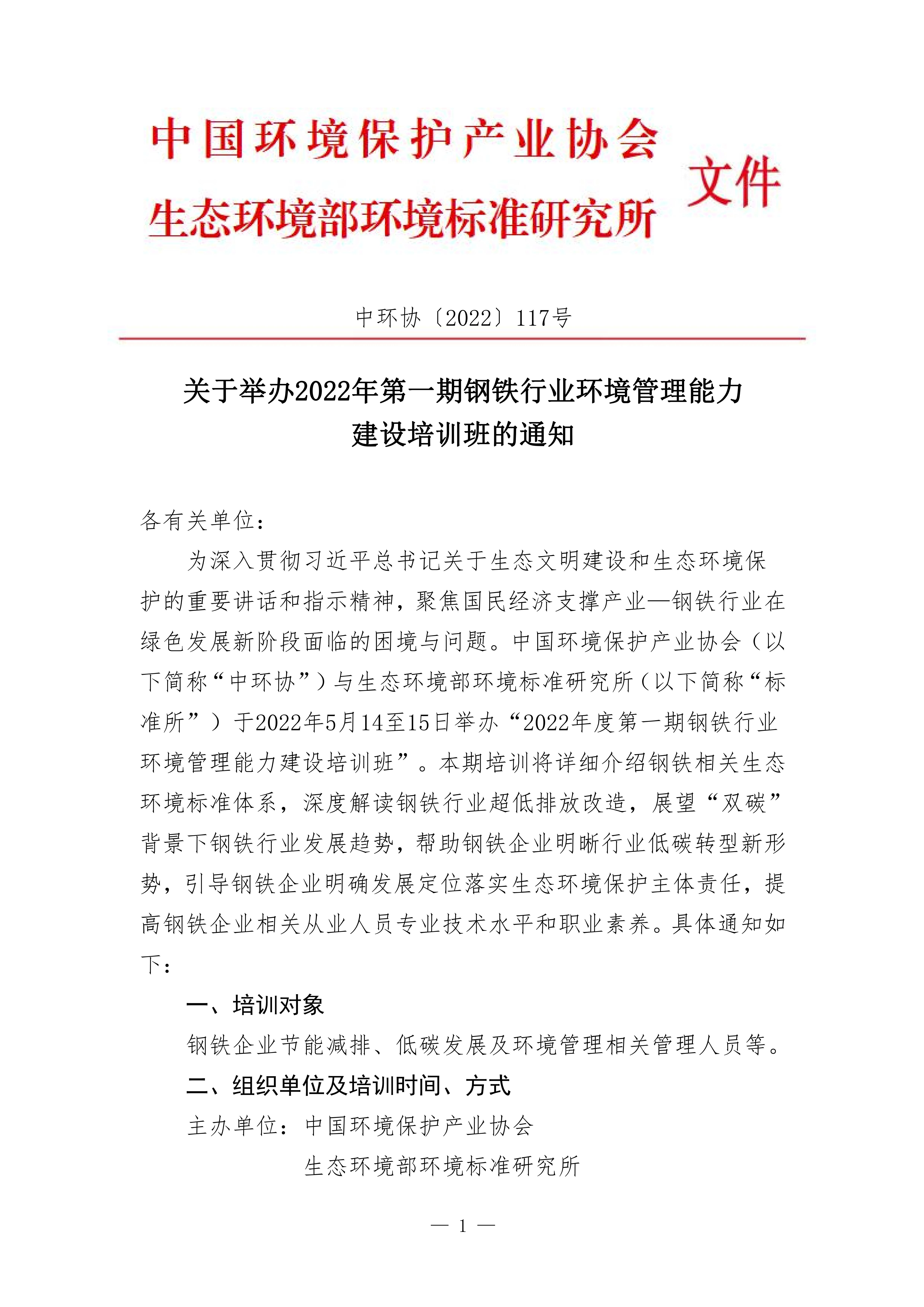 關(guān)于舉辦2022年第一期鋼鐵行業(yè)環(huán)境管理能力建設培訓班的通知
